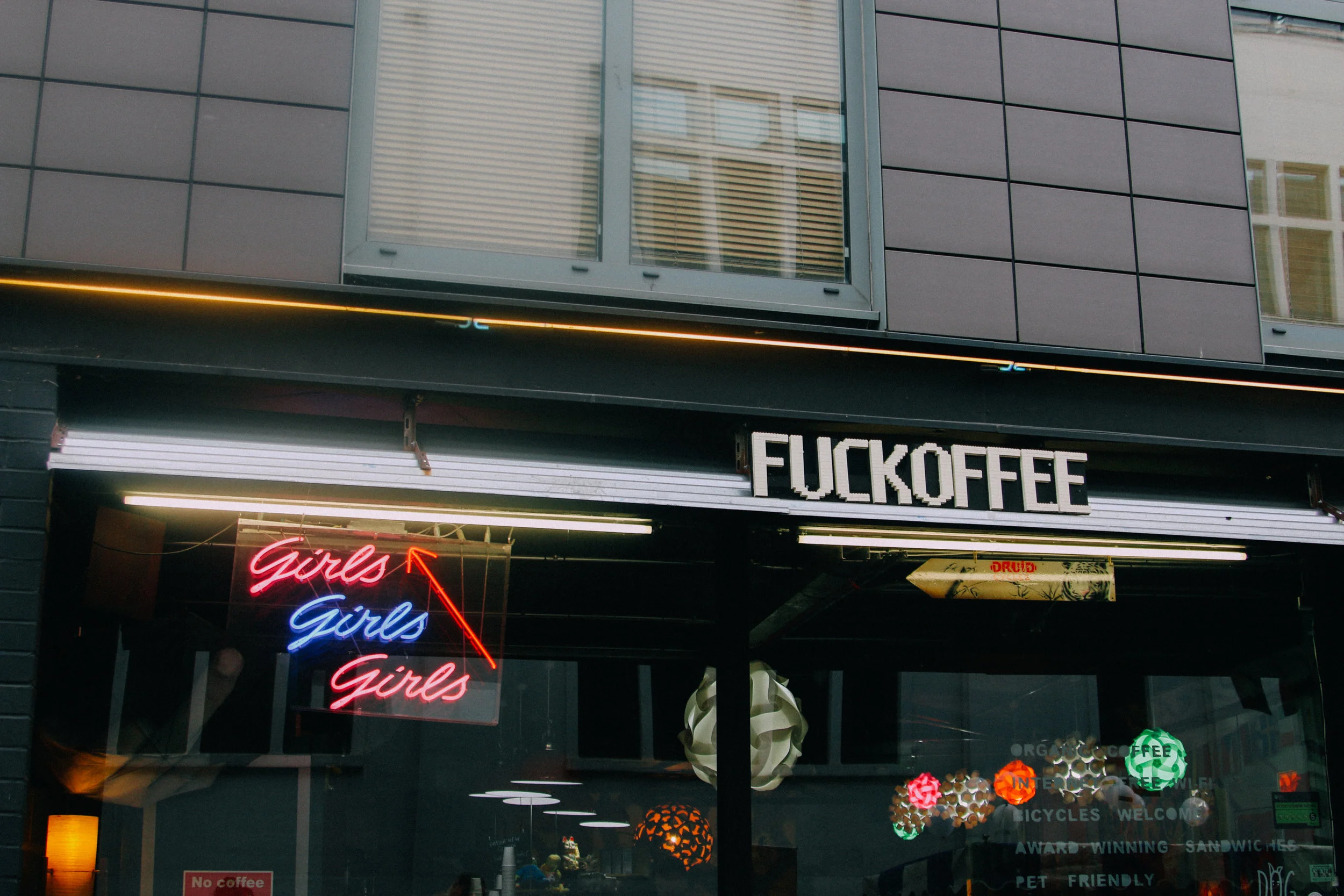 Most unique/offensive coffee shop in London award would probably go to this vulgarly named place in Bermondsy. They definitely got in trouble back in the day for the name (the cease and desist letter they received from the government is framed in the toilet), but I think it's since been okayed.